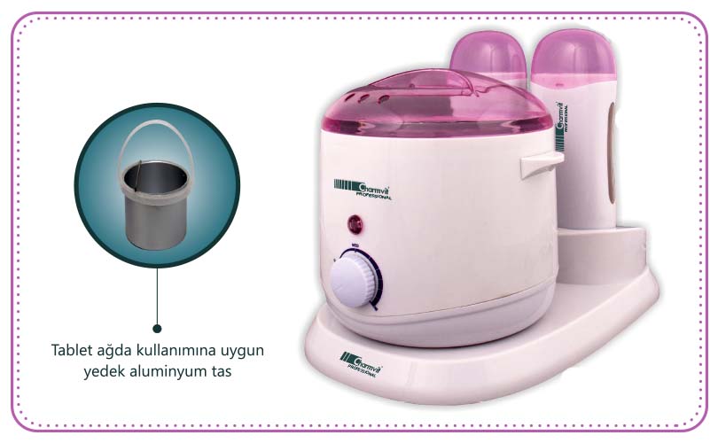 CM007 Wax Heater 2+1 Transport and use with adjustable can warmer Thermostatized heater covering 360° inside the device Replacement aluminum bowl for tablet wax use Unbreakable durable double-colored plastic body Cover with air hole